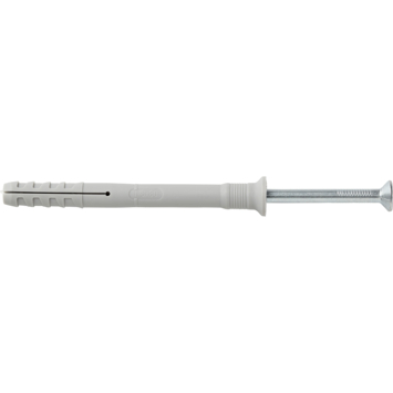 Deze Fischer-nagelplug N8x80Z, verpakt per 50 stuks, gebruikt u voor het monteren van houten regelwerk op verschillende materialen. Denk aan betonnen wanden, wandverbindingen en metalen profielen. Gebruik voor het boren van het gat waarin u de nagelplug aanbrengt, een boor met een diameter van 8mm. De 80mm lange nagelplug brengt u aan en vervolgens de schroef van 85mm met een diameter van 5mm. Na montage is deze nagelplug met een lengte van 6cm, afhankelijk van het materiaal waarin u de plug bevestigt, te belasten tot maximaal 27kg. U koopt de Fischer-nagelplug N8x80Z per 50 nagelpluggen.