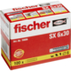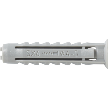 Dankzij de vierzijdige spreiding is de Fischer SX-plug SX6 van nylon een krachtige plug waarmee u voorwerpen stevig bevestigt. De SX-pluggen krijgt u geleverd per 100 stuks. De plug met vierzijdige spreiding is geschikt voor montage in beton en massieve steen, maar ook in holle steen en porenbeton. U bevestigt de plug dan in combinatie met een spaanplaatschroef en houtdraadbout. Het is mogelijk om middelzware tot zware voorwerpen te monteren met deze SX-pluggen van Fischer en passende schroeven. Denk aan schilderijen, lampen, brievenbussen en kleine legplanken, maar ook bad- en toiletmontages, kledingkasten en rolluiken. De 100 Fischer-pluggen hebben een lengte van 30mm en kunnen een maximale belasting van 65kg aan, afhankelijk van het materiaal. De verpakking met SX-pluggen bevat in totaal 100 pluggen.