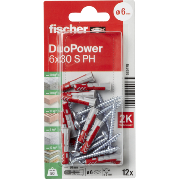 Fischer Universeelplug DuoPower 6x30mm met bolkopschroef 12 stuks
