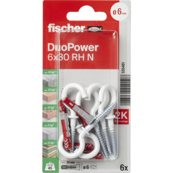 Fischer Universeelplug DuoPower 6x30mm met witte schroefhaak 6 stuks