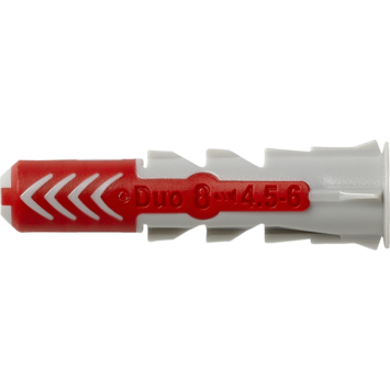 De Duopowerplug 8x40mm is geschikt voor zowel voor- als doorsteekmontage. Meer materiaal in de plug voor nog meer spreiding en nóg hogere belastbaarheid. De combinatie van een harde en zachte kunststof garandeert een optimaal gebruiksgemak, zeer gemakkelijke plaatsing en bovendien een duidelijke feedback wanneer de plug correct geplaatst is. Geschikt voor hout- , spaanplaat- én stokschroeven. Schroeflengte = pluglengte + dikte aanbouwdeel + 1x schroefdiameter. In het geval van plaatmateriaal dient het gladde deel van de schroef niet langer te zijn dan de dikte van het aanbouwdeel. De combinatie van 2 materialen en 3 werkingsprincipes maakt de DUOPOWER de juiste plug voor alle omstandigheden. De plug activeert het optimale werkingsprincipe - spreiden, vouwen, knopen - afhankelijk van de ondergrond. Best mogelijke terugkoppeling van de plug, het is duidelijk voelbaar wanneer de schroef goed is aangedraaid. De korte en compacte plug staat voor minimale boortijd en bespaart daarmee materiaal én tijd. De dunne kraag voorkomt dat de plug in het boorgat verdwijnt bij gebruik in holle wanden, terwijl doorsteekmontage nog steeds mogelijk blijft. De vertande anti-rotatievleugels voorkomen dat de plug tijdens montage in het boorgat meedraait. Verpakking is 18 stuks.