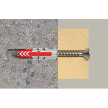 De Duopowerplug 8x40 mm met schroef is geschikt voor zowel voor- als doorsteekmontage. Meer materiaal in de plug voor nog meer spreiding en nóg hogere belastbaarheid. De combinatie van een harde en zachte kunststof garandeert een optimaal gebruiksgemak, zeer gemakkelijke plaatsing en bovendien een duidelijke feedback wanneer de plug correct geplaatst is. Geschikt voor hout- , spaanplaat- én stokschroeven. Schroeflengte = pluglengte + dikte aanbouwdeel + 1x schroefdiameter. In het geval van plaatmateriaal dient het gladde deel van de schroef niet langer te zijn dan de dikte van het aanbouwdeel. De combinatie van 2 materialen en 3 werkingsprincipes maakt de DUOPOWER de juiste plug voor alle omstandigheden. De plug activeert het optimale werkingsprincipe - spreiden, vouwen, knopen - afhankelijk van de ondergrond. Best mogelijke terugkoppeling van de plug, het is duidelijk voelbaar wanneer de schroef goed is aangedraaid. De korte en compacte plug staat voor minimale boortijd en bespaart daarmee materiaal én tijd. De dunne kraag voorkomt dat de plug in het boorgat verdwijnt bij gebruik in holle wanden, terwijl doorsteekmontage nog steeds mogelijk blijft. De vertande anti-rotatievleugels voorkomen dat de plug tijdens montage in het boorgat meedraait. Verpakking is 8 stuks.