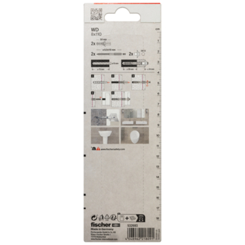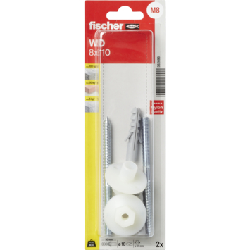 Deze Fischer wastafelbevestigingsset WD 8x110K is speciaal geschikt voor het ophangen van wastafels. De universele plug is geschikt voor alle massieve, holle en plaatmaterialen en kunt u dus eigenlijk overal gebruiken. Dankzij de afdekkappen met hoogwaardige chroomafwerklaag ziet de bevestiging er ook na jaren nog fraai uit. Om te voorkomen dat het porselein beschadigt, zit er een kraaghuls op de Fischer wastafelbevestiging. Deze is vervaardigd van nylon en bestand tegen veroudering en chemicaliën. Zorg ervoor dat de stokschroef halverwege met een waterpomptang ingedraaid wordt. Eén verpakking bevat 2 pluggen met 2 stokschroeven en 2 kraagmoeren, inclusief montagehandleiding.