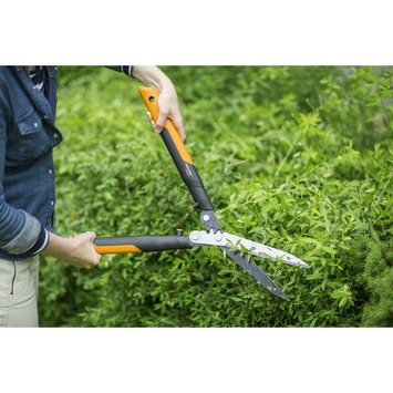 Fiskars PowerGear™ heggenscharen zijn de beste in hun klasse vanwege het ergonomische ontwerp, de degelijke, duurzame materialen en het innovatieve gepatenteerde transmissiemechanisme dat optimale snoeikracht biedt en het gebruiksgemak vergroot. Het unieke mechanisme zorgt voor meer hefboom effect op de uiteinden zodat het gehele lemmet wordt gebruikt voor het knippen, waardoor het snoeien van takken lichter en makkelijker wordt. Fiskars PowerGear™ takkenscharen zijn verkrijgbaar in twee modellen en zijn beide voorzien van het gepatenteerde PowerGear™-mechanisme.