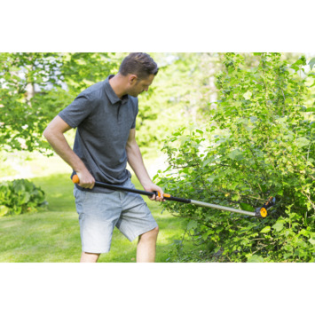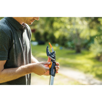 Fiskars snoeigiraffes maken het mogelijk om te snoeien op moeilijk bereikbare plaatsen, zoals in boomtoppen of juist dicht bij de grond. Hierdoor kun je comfortabel snoeien zonder een ladder te gebruiken of voorover te buigen. Het kettingmechanisme en het rolkoordsysteem zorgen voor een enorme krachtbesparing. De snoeikop kan 230° worden gedraaid, zodat je in iedere positie comfortabel kunt werken.