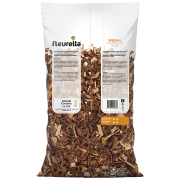 Fleurella Speelmix is een mix van boomschors en houtsnippers die je tuin een natuurlijke uitstraling geeft en tegelijk optimale bescherming biedt onder speeltoestellen. De veerkrachtige laag vermindert de impact bij een val. Dankzij de goede drainerende werking blijft het oppervlak droger en ontstaan er minder waterplassen. De mix is 100% natuurlijk en vormt een stabiele, gelijkmatige laag die goed blijft liggen. Voor optimale bescherming leg je een laag van 20-30 cm aan. Eén bigbag van 1 ENm³ is ideaal voor speelzones van gemiddelde grootte.