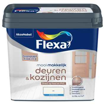 Flexa Mooi Makkelijk Deuren & Kozijnen is een lak en grondverf in één. De lak is slijtvast, kras-en stootvast, wat betekent dat deuren en kozijnen langdurig bestand zijn tegen intensief gebruik. Na droging is het oppervlak goed reinigbaar met een vochtige doek. Een goede voorbereiding van de deuren en kozijnen is belangrijk om een sterk, kras-en stootvast resultaat te behalen.. De lak niet verwerken beneden 10°C. Bij 20°C is de verf stofdroog na 1 uur en overschilderbaar na 6 uur. De lak heeft een rendement van 9m² per liter.
