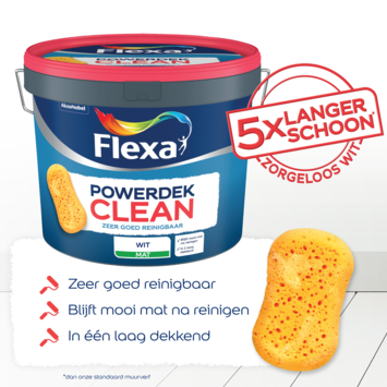 Flexa Powerdek Clean is een matte, reinigbare muurverf. Flexa Powerdek behoudt haar kleur en matte afwerking bij het schoonmaken en is daarom geschikt voor ruimten die gemakkelijk vuil worden, zoals de woonkamer of kinderkamers. Powerdek Clean is geschikt voor ondergronden zoals stucwerk, beton, steen, gipskarton, glasweefsel, papierbehang en eerder geschilderde muren en plafonds. De verf niet verwerken beneden 10°C. Bij 20°C is de verf na 2 uur stofdroog en overschilderbaar na 6 uur. De verf heeft een rendement van 10m² per liter.