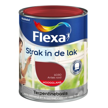 Flexa Strak in de lak hoogglans lak in de kleur antiekrood is geschikt voor binnen en buitengebruik. De terpentinegedragen lak is toepasbaar op hout en i.c.m. de juiste grondverf ook op metaal en harde kunststoffen. Gebruik Flexa Strak in de lak bijvoorbeeld voor het lakken van uw kozijnen of deuren. De antiekrode hoogglans lak van Flexa Strak in de lak heeft een optimale dekking en is krasvast. De inhoudsmaat is 750 ml. Naast de standaard beschikbare kleuren is deze lak in meer dan 30.000 verschillende kleuren te verkrijgen bij onze verfmengbalie in de GAMMA bouwmarkt.