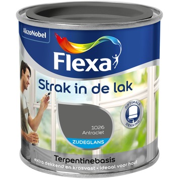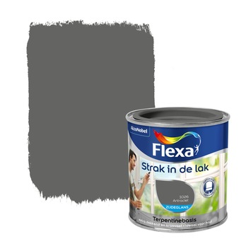 Flexa Strak in de lak zijdeglans lak in de kleur antraciet is geschikt voor binnen en buitengebruik. De terpentinegedragen lak is toepasbaar op hout en i.c.m. de juiste grondverf ook op metaal en harde kunststoffen. Gebruik Flexa Strak in de lak bijvoorbeeld voor het lakken van uw kozijnen of deuren. De antraciet zijdeglans lak van Flexa Strak in de lak heeft een optimale dekking en is krasvast. De inhoudsmaat is 250 ml. Naast de standaard beschikbare kleuren is deze lak in meer dan 30.000 verschillende kleuren te verkrijgen bij onze verfmengbalie in de GAMMA bouwmarkt.