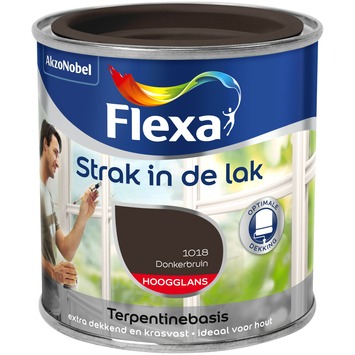 Flexa Strak in de lak hoogglans lak in de kleur donker bruin is geschikt voor binnen en buitengebruik. De terpentinegedragen lak is toepasbaar op hout en i.c.m. de juiste grondverf ook op metaal en harde kunststoffen. Gebruik Flexa Strak in de lak bijvoorbeeld voor het lakken van uw kozijnen of deuren. De donker bruine hoogglans lak van Flexa Strak in de lak heeft een optimale dekking en is krasvast. De inhoudsmaat is 250 ml. Naast de standaard beschikbare kleuren is deze lak in meer dan 30.000 verschillende kleuren te verkrijgen bij onze verfmengbalie in de GAMMA bouwmarkt.