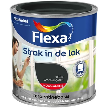 Flexa Strak in de lak hoogglans lak in de kleur grachtengroen is geschikt voor binnen en buitengebruik. De terpentinegedragen lak is toepasbaar op hout en i.c.m. de juiste grondverf ook op metaal en harde kunststoffen. Gebruik Flexa Strak in de lak bijvoorbeeld voor het lakken van uw kozijnen of deuren. De grachtengroene hoogglans lak van Flexa Strak in de lak heeft een optimale dekking en is krasvast. De inhoudsmaat is 250 ml. Naast de standaard beschikbare kleuren is deze lak in meer dan 30.000 verschillende kleuren te verkrijgen bij onze verfmengbalie in de GAMMA bouwmarkt.