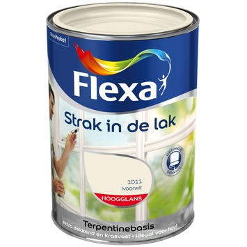 Flexa Strak in de lak hoogglans lak in de kleur ivoorwit is geschikt voor binnen en buitengebruik. De terpentinegedragen lak is toepasbaar op hout en i.c.m. de juiste grondverf ook op metaal en harde kunststoffen. Gebruik Flexa Strak in de lak bijvoorbeeld voor het lakken van uw kozijnen of deuren. De ivoorwitte hoogglans lak van Flexa Strak in de lak heeft een optimale dekking en is krasvast. Lichte kleuren op terpentinebasis kunnen binnenshuis naar verloop van tijd geel worden op plaatsen die niet veel in contact komen met daglicht. Op deze plaatsen kunt u daarom het beste een lak op waterbasis gebruiken. De inhoudsmaat is 1,25 liter. Naast de standaard beschikbare kleuren is deze lak in meer dan 30.000 verschillende kleuren te verkrijgen bij onze verfmengbalie in de GAMMA bouwmarkt.