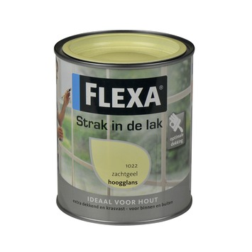 Flexa Strak in de lak Hoogglans 750ML 1022 Zachtgeel is een aflak op terpentinebasis die je zowel binnen als buiten kunt gebruiken. Je kunt het met de kwast en met de roller aanbrengen op bijvoorbeeld deuren en kozijnen. Door de extra dekking en goede vloeiing bereik je met Flexa Strak in de lak eenvoudig en snel een mooi en strak eindresultaat. Flexa Strak in de lak is krasvast en vergeeld bijna niet. Daardoor maak je met Flexa Strak in de lak Hoogglans duurzaam mooi schilderwerk met een vertrouwde kwaliteit.