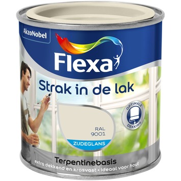 Flexa Strak in de lak zijdeglans lak RAL 9001 is geschikt voor binnen en buitengebruik. De terpentinegedragen lak is toepasbaar op hout en i.c.m. de juiste grondverf ook op metaal en harde kunststoffen. Gebruik Flexa Strak in de lak bijvoorbeeld voor het lakken van uw kozijnen of deuren. De RAL 9001 zijdeglans lak van Flexa Strak in de lak heeft een optimale dekking en is krasvast. Lichte kleuren op terpentinebasis kunnen binnenshuis naar verloop van tijd geel worden op plaatsen die niet veel in contact komen met daglicht. Op deze plaatsen kunt u daarom het beste een lak op waterbasis gebruiken. De inhoudsmaat is 250 ml. Naast de standaard beschikbare kleuren is deze lak in meer dan 30.000 verschillende kleuren te verkrijgen bij onze verfmengbalie in de GAMMA bouwmarkt.