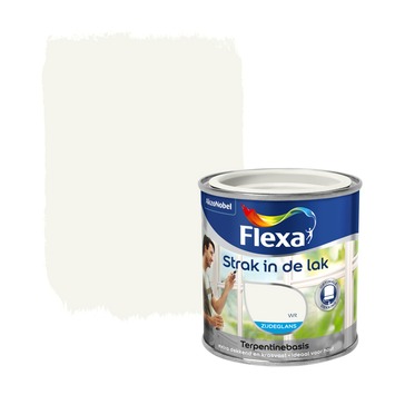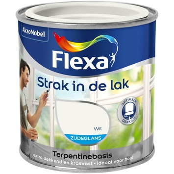Flexa Strak in de lak zijdeglans lak in de kleur wit is geschikt voor binnen en buitengebruik. De terpentinegedragen lak is toepasbaar op hout en i.c.m. de juiste grondverf ook op metaal en harde kunststoffen. Gebruik Flexa Strak in de lak bijvoorbeeld voor het lakken van uw kozijnen of deuren. De witte zijdeglans lak van Flexa Strak in de lak heeft een optimale dekking en is krasvast. Lichte kleuren op terpentinebasis kunnen binnenshuis naar verloop van tijd geel worden op plaatsen die niet veel in contact komen met daglicht. Op deze plaatsen kunt u daarom het beste een lak op waterbasis gebruiken. De inhoudsmaat is 250 ml. Naast de standaard beschikbare kleuren is deze lak in meer dan 30.000 verschillende kleuren te verkrijgen bij onze verfmengbalie in de GAMMA bouwmarkt.