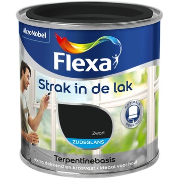 Flexa Strak in de lak zijdeglans lak in de kleur zwart is geschikt voor binnen en buitengebruik. De terpentinegedragen lak is toepasbaar op hout en i.c.m. de juiste grondverf ook op metaal en harde kunststoffen. Gebruik Flexa Strak in de lak bijvoorbeeld voor het lakken van uw kozijnen of deuren. De zwarte zijde glans lak van Flexa Strak in de lak heeft een optimale dekking en is krasvast. De inhoudsmaat is 250 ml. Naast de standaard beschikbare kleuren is deze lak in meer dan 30.000 verschillende kleuren te verkrijgen bij onze verfmengbalie in de GAMMA bouwmarkt.