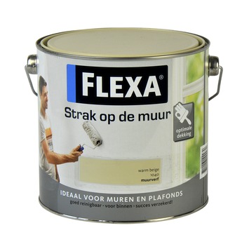 Flexa Strak op de muur Muurverf 2,5 ltr. 1040 Warm Beige is een oplosmiddelvrije, matte muurverf voor binnen. Het is geschikt voor muren en plafonds binnenshuis en ook voor badkamers en keukens. Flexa Strak op de muur heeft een goede dekking en is eenvoudig aan te brengen. Je kunt het met een blokwitter of roller aanbrengen op bijvoorbeeld muren, plafonds, schoon metselwerk, papierbehang, gipskarton en (glad) pleisterwerk. Het is schrobvast en daardoor eenvoudig reinigbaar. De kleuren van Flexa Strak op de muur Muurverf zijn kleurecht en blijven lang mooi, daardoor ben je verzekerd van een perfect en blijvend mooi eindresultaat.