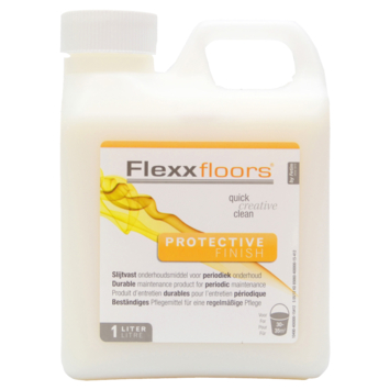 Met het Flexxfloors onderhoudsmiddel protective finish 1 liter blijft uw kunststof vloer jarenlang mooi. Tijdens de periodieke grote schoonmaak legt u met deze finisher een slijtvaste beschermlaag over uw vloer aan. Met een volume van 1 liter weekt u gemakkelijk 30 tot 35 vierkante meter in. Dit Flexxfloors onderhoudsmiddel behaalt het beste resultaat in combinatie met voorafgaande behandeling met Flexxfloors intensive cleaner en met regelmatig gebruik van Flexxfloors daily cleaner. Met een stempel van der Grüne Punkt is dit product overigens milieuvriendelijk. Flexxfloors onderhoudsmiddel protective finish is een onmisbaar product voor langdurig onderhoud van uw vloer.