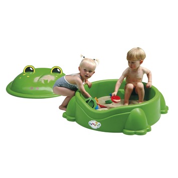 Freddy kikker zandbak met twee geïntegreerde zitplaatsen. Met deksel, om het zand te beschermen tegen invloeden van buitenaf. Dit speelgoed is geschik voor kinderen vanaf 1 jaar.