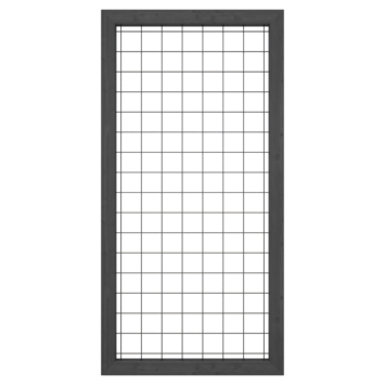 Het gaasscherm recht vuren geschaafd geïmpregneerd en gespoten zwart is 180 cm hoog, 90 cm breed en 4,4 cm diep. Het gaasscherm heeft zwart gespoten ijzer verzinkte mazen van 10 x 10 cm. De lijst is gemaakt van vuren hout. Vuren is de meest gebruikte naaldhoutsoort in Europa omdat het zich goed laat verwerken en een middelmatige tekening in het hout heeft. Gemiddeld genomen kent vuren kleine tot middelgrote kwasten. Om de levensduur te verlengen wordt deze houtsoort vacuümdruk geïmpregneerd met Tanalith E. Deze methode zorgt ervoor dat de levensduur verlengd wordt tot 10-15 jaar en dat het hout resistent wordt tegen (oppervlakte) schimmels. Na het impregneren is het gaasscherm zwart gespoten. Het scherm kan zowel horizontaal als verticaal met (6x) L-beslag met schroef en RVS schroeven bevestigd worden.