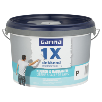 GAMMA 1x dekkend Keuken & Badkamer is een uitstekend dekkende, matte muurverf met schimmel- en vochtbestendige eigenschap-pen. Ideaal voor muren en plafonds in vochtige ruimtes binnenshuis zoals keukens en badkamers. De verf maakt muren veelvuldig reinigbaar, is ademend, reukarm en gemakkelijk aan te brengen. Afhankelijk van de kleur en kwaliteit van de ondergrond dekt deze verf in één laag.