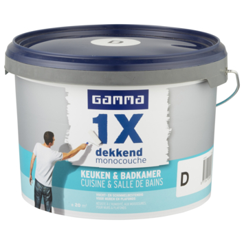 GAMMA 1x dekkend Keuken & Badkamer is een uitstekend dekkende, matte muurverf met schimmel- en vochtbestendige eigenschap-pen. Ideaal voor muren en plafonds in vochtige ruimtes binnenshuis zoals keukens en badkamers. De verf maakt muren veelvuldig reinigbaar, is ademend, reukarm en gemakkelijk aan te brengen. Afhankelijk van de kleur en kwaliteit van de ondergrond dekt deze verf in één laag.