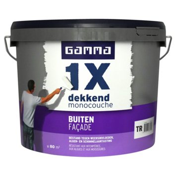 GAMMA 1x dekkend buiten muurverf mat 10 liter is een uitstekend dekkende, weerbestendige en matte muurverf. Ideaal voor het schilderen van buitengevels en muren. De schimmelwerende ingrediënten van de verf zorgen voor een beschermende laag die de muur beschermt tegen weersinvloeden, algen- en schimmelaantasting.