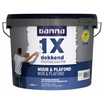 GAMMA 1x dekkend muur & plafond latex mat RAL 9010 gebroken wit 10 liter is de beste keuze voor een strak en egaal eindresultaat. GAMMA 1x dekkend is een optimaal dekkende, afneembare (schrobklasse 2) en matte muurverf. Universeel toepasbaar voor muren en plafonds in droge ruimtes binnenshuis zoals de woon of slaapkamer. De GAMMA latex 1x dekkend muur & plafond heeft altijd een strak en steeploos eind resultaat. Verfbanen en strepen vloeien tijdens het drogen naadloos in elkaar over. Afhankelijk van kleur en kwaliteit van de ondergrond dekt deze verf in één laag. Bij donkere of felle kleuren heb je meer verflagen nodig voor een optimale dekking. GAMMA latex 1x dekkend muur & plafond is beschikbaar in de kleuren Wit, RAL 9010 gebroken wit en RAL 9016 verkeerswit.