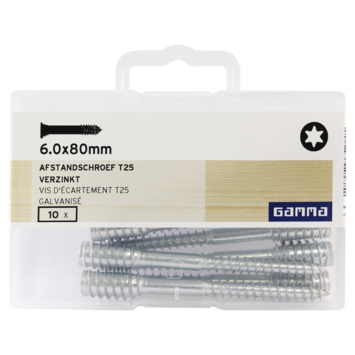 Deze afstandschroef van GAMMA is gemaakt van verzinkt metaal en heeft een torx-aandrijving. De schroef is speciaal ontwikkeld voor het verbinden van twee oppervlakken met lege ruimte daartussen. Denk aan het vastschroeven van kozijnen, stellen van regelwerk op wanden, balken en verlaagde plafonds en kozijnen zonder opvulblokjes aan de muur. Afstandschroeven worden vooral gebruikt voor verbindingen die door de spouwmuur heen worden aangebracht en bij het ophangen van een plafond. Een andere toepassing is de bevestiging van een stelling, bed of ander voorwerp, tegen een muur aan waarbij het voorwerp niet direct tegen de muur geplaatst wordt, bijvoorbeeld omdat een plint in de weg zit. Deze afstandschroef heeft een afmeting van 6mm bij 80mm. Eén verpakking bevat 10 stuks.