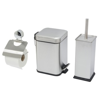 De GAMMA toiletset 3-delig vierkant mat bevat onmisbare accessoires voor in uw sanitaire ruimtes. De set bevat een vierkante pedaalemmer, een bijpassende toiletrolhouder en een bijpassende toiletborstel. Alle accessoires zijn uitgevoerd in mat chroom. Uw badkamer of toiletruimte maakt u af in stijl met behulp van deze toiletset. U vindt in het assortiment van GAMMA ook een ruime keuze in toiletpotten, toiletbrillen en overige toiletaccessoires. Kortom, voor de inrichting van uw toilet bent u bij GAMMA aan het juiste adres.