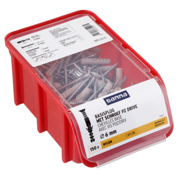 De GAMMA Basisplug nylon Ø 6mm met schroef, de meest gebruikte plug voor toepassing in massieve bouwmaterialen, zoals beton en massieve steen. U koopt de basisplug per 150 stuks, inclusief universeelschroef vz van 4x40mm . De basisplug is 30mm lang en heeft diepe vertanding .Zo bevestigt u met deze plug en universeelschroef vz middelzware materialen aan muren en wanden, bijvoorbeeld schilderijen, plinten en legplanken. De universeelschroef vz roest niet waardoor u deze ook buiten of in natte ruimtes, zoals de badkamer, kunt toepassen. De universeelschroef vz is 4mm dik en 40mm lang. Voorboren met een boormaat van 6mm benodigd. Dan zorgt u voor de meest stevige bevestiging. De verpakking bevat in totaal 150 basispluggen van 6mm dikte met bijbehorende universeelschroef vz