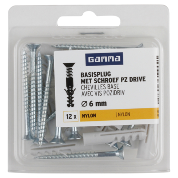 De GAMMA Basisplug nylon Ø 6mm met schroef, de meest gebruikte plug voor toepassing in massieve bouwmaterialen, zoals beton en massieve steen. U koopt de basisplug per 12 stuks, inclusief universeelschroef vz van 4x45mm . De basisplug is 30mm lang en heeft diepe vertanding .Zo bevestigt u met deze plug en universeelschroef vz middelzware materialen aan muren en wanden, bijvoorbeeld schilderijen, plinten en legplanken. De universeelschroef vz roest niet waardoor u deze ook buiten of in natte ruimtes, zoals de badkamer, kunt toepassen. De universeelschroef vz is 4mm dik en 45mm lang. Voorboren met een boormaat van 6mm benodigd. Dan zorgt u voor de meest stevige bevestiging. De verpakking bevat in totaal 12 basispluggen van 6mm dikte met bijbehorende universeelschroef vz