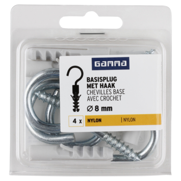 De GAMMA Basisplug nylon Ø 8mm met haak, de meest gebruikte plug voor toepassing in massieve bouwmaterialen, zoals beton en massieve steen. U koopt de basisplug per 4 stuks, inclusief haak van 6x65mm . De basisplug is 40mm lang en heeft diepe vertanding .Zo bevestigt u met deze plug en haak middelzware materialen aan muren en wanden, bijvoorbeeld schilderijen, plinten en legplanken. De haak roest niet waardoor u deze ook buiten of in natte ruimtes, zoals de badkamer, kunt toepassen. De haak is 6mm dik en 65mm lang. Voorboren met een boormaat van 8mm benodigd. Dan zorgt u voor de meest stevige bevestiging. De verpakking bevat in totaal 4 basispluggen van 8mm dikte met bijbehorende haak