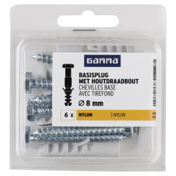 De GAMMA Basisplug nylon Ø 8mm met houtdraadbout, de meest gebruikte plug voor toepassing in massieve bouwmaterialen, zoals beton en massieve steen. U koopt de basisplug per 6 stuks, inclusief houtdraadbout van 6x50mm . De basisplug is 40mm lang en heeft diepe vertanding .Zo bevestigt u met deze plug en houtdraadbout middelzware materialen aan muren en wanden, bijvoorbeeld schilderijen, plinten en legplanken. De houtdraadbout roest niet waardoor u deze ook buiten of in natte ruimtes, zoals de badkamer, kunt toepassen. De houtdraadbout is 6mm dik en 50mm lang. Voorboren met een boormaat van 8mm benodigd. Dan zorgt u voor de meest stevige bevestiging. De verpakking bevat in totaal 6 basispluggen van 8mm dikte met bijbehorende houtdraadbout