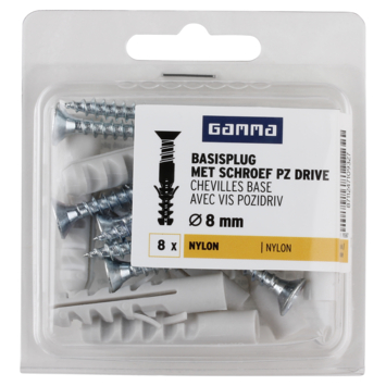De GAMMA Basisplug nylon Ø 8mm met schroef, de meest gebruikte plug voor toepassing in massieve bouwmaterialen, zoals beton en massieve steen. U koopt de basisplug per 8 stuks, inclusief universeelschroef vz van 5x50mm . De basisplug is 40mm lang en heeft diepe vertanding .Zo bevestigt u met deze plug en universeelschroef vz middelzware materialen aan muren en wanden, bijvoorbeeld schilderijen, plinten en legplanken. De universeelschroef vz roest niet waardoor u deze ook buiten of in natte ruimtes, zoals de badkamer, kunt toepassen. De universeelschroef vz is 5mm dik en 50mm lang. Voorboren met een boormaat van 8mm benodigd. Dan zorgt u voor de meest stevige bevestiging. De verpakking bevat in totaal 8 basispluggen van 8mm dikte met bijbehorende universeelschroef vz
