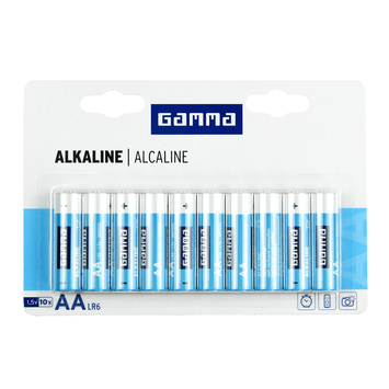 GAMMA Batterij Alkaline AA 10 stuks ook bekend als LR6, MN1500, AM3, UM3, HP7, D14, mignon of penlite. Zijn geschikt voor verschillende toepassingen zoals fotocamera's, zaklampen, afstandsbedieningen en speelgoed. In één verpakking zitten 10 AA batterijen.