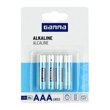 GAMMA Batterij Alkaline AAA 4 stuks ook bekend als LR3, LR03, MN2400, AM4, HP16, micro batterij, potlood batterij. Zijn geschikt voor verschillende toepassingen zoals fotocamera's, zaklampen, afstandsbedieningen en speelgoed. In één verpakking zitten 4 AAA batterijen.