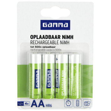 GAMMA Batterij Oplaadbaar AA 4 stuks. Deze batterij van 2400mAh is tot 500x herlaadbaar. Ook bekend als HR6, penlite, mignon. De GAMMA Batterij Oplaadbaar AA 4 stuks zijn direct te gebruiken.