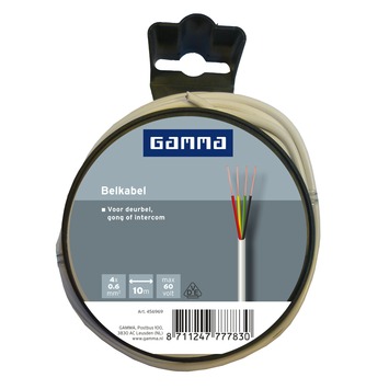 De GAMMA belkabel (4x0,6 mm²) is geschikt voor het aansluiten van een gong, deurbel of intercom met een maximale spanning van 60 Volt. Bevat vier aders: rood - blauw - oranje - wit. Lengte: 10 meter. Kleur: wit.