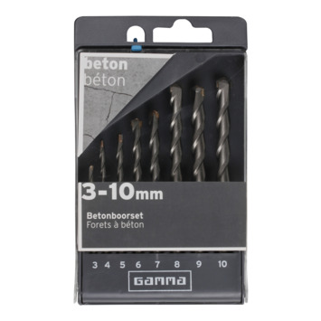 De Gamma betonborenset is uitermate geschikt om te boren in harde steensoorten. De set bestaat uit een achttal boren in de maten 3, 4, 5, 6, 7, 8, 9 en 10mm. De boren beschikken over een stompe, hardmetalen (beitel)punt. De betonboren kunnen voor boren in beton in een (accu)boorhamer gebruikt worden en voor zachtere steensoorten ook in een (accu)klopboor