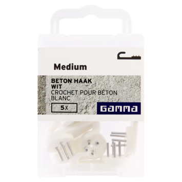 Deze middelgrote betonhaak van GAMMA is gemaakt van wit nylon. Met een betonhaak kan je eenvoudig een haakje monteren op een betonnen wand of in een stenen muur. Dat wil zeggen: zonder gebruik van een boormachine. De 4 stalen spijkers kan je met een hamer eenvoudig vastzetten in het beton. In zachtere steensoorten kan je een langere stalen nagel gebruiken. Hiervoor is een gaatje open gelaten tussen de spijkers in. De haak is vrij eenvoudig weer te verwijderen met een tang. Deze middelgrote haak heeft een afmeting van 3x1,5x0,8cm. LET OP: Maximale draagvermogen van 6kg. Eén verpakking bevat 5 stuks betonhaken.