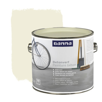 GAMMA betonverf beige 2,5 liter is een goed hechtende en slijtvaste, matte betonverf die u zowel voor binnen als buiten kunt gebruiken. De verf is met een of roller gemakkelijk aan te brengen op vloeren en wanden van beton of andere steenachtige materialen zoals balkons, trappen en trottoirtegels. Dit product is op waterbasis en daarom geurarm en sneldrogend. Na 6 uur is het overschilderbaar met een volgende verflaag. Naast de standaard beschikbare kleuren is deze verf in meer dan 30.000 verschillende kleuren te verkrijgen bij onze verfmengbalie in de GAMMA bouwmarkt. Eén blik van 2,5 liter volstaat voor het schilderen van een oppervlakte van 33 m2.