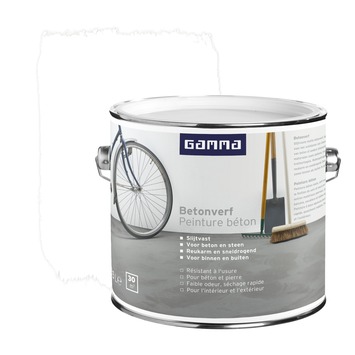 GAMMA betonverf wit 2,5 liter is een goed hechtende en slijtvaste, matte betonverf die u zowel voor binnen als buiten kunt gebruiken. De verf is met een of roller gemakkelijk aan te brengen op vloeren en wanden van beton of andere steenachtige materialen zoals balkons, trappen en trottoirtegels. Dit product is op waterbasis en daarom geurarm en sneldrogend. Na 6 uur is het overschilderbaar met een volgende verflaag. Naast de standaard beschikbare kleuren is deze verf in meer dan 30.000 verschillende kleuren te verkrijgen bij onze verfmengbalie in de GAMMA bouwmarkt. Eén blik van 2,5 liter volstaat voor het schilderen van een oppervlakte van 33 m2.