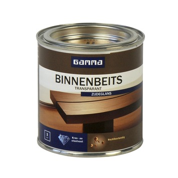 GAMMA binnenbeits transparant beuken zijdeglans 250 ml is een zijdeglans beits voor het kleuren en beschermen van hout binnenshuis. Het is een transparant product waardoor de houtnerf zichtbaar blijft. Dit product is op waterbasis wat als voordeel heeft dat het snel droogt en geurarm is. Het is al na 4 uur overschilderbaar met een eventuele volgende beitslaag. Eén blik van 250 ml volstaat voor het schilderen van een oppervlakte van 3 m2. Het product is beschikbaar in diverse kant en klare kleuren.