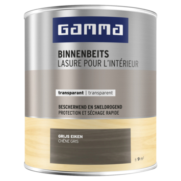GAMMA Binnenbeits grijs eiken 750 ml is een kras- en stootvaste transparante beits op waterbasis. Voor het afwerken van (onbehandelde) houten meubels, deuren en kozijnen, plinten, lambriseringen en ander timmerwerk binnenshuis. Beschermt tegen vocht en vlekken en accentueert de houtnerf. Sneldrogend, geur- en oplosmiddelarm. De uiteindelijke kleur is afhankelijk van het soort hout en aantal lagen. Stofdroog na ± 1 uur en overschilderbaar na ± 4 uur. De krasvastheid is, afhankelijk van de kleur, na 15-30 dagen bereikt.