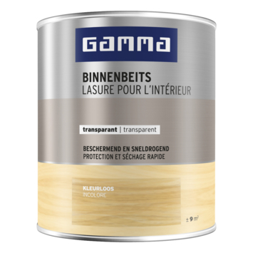 GAMMA Binnenbeits kleurloos 750 ml is een kras- en stootvaste transparante beits op waterbasis. Voor het afwerken van (onbehandelde) houten meubels, deuren en kozijnen, plinten, lambriseringen en ander timmerwerk binnenshuis. Beschermt tegen vocht en vlekken en accentueert de houtnerf. Sneldrogend, geur- en oplosmiddelarm. De uiteindelijke kleur is afhankelijk van het soort hout en aantal lagen. Stofdroog na ± 1 uur en overschilderbaar na ± 4 uur. De krasvastheid is, afhankelijk van de kleur, na 15-30 dagen bereikt.