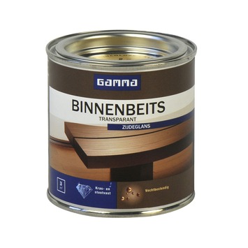 GAMMA binnenbeits transparant kleurloos zijdeglans 250 ml is een zijdeglans beits voor het kleuren en beschermen van hout binnenshuis. Het is een transparant product waardoor de houtnerf zichtbaar blijft. Dit product is op waterbasis wat als voordeel heeft dat het snel droogt en geurarm is. Het is al na 4 uur overschilderbaar met een eventuele volgende beitslaag. Eén blik van 250 ml volstaat voor het schilderen van een oppervlakte van 3 m2. Het product is beschikbaar in diverse kant en klare kleuren.