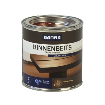 GAMMA binnenbeits transparant mahonie zijdeglans 250 ml is een zijdeglans beits voor het kleuren en beschermen van hout binnenshuis. Het is een transparant product waardoor de houtnerf zichtbaar blijft. Dit product is op waterbasis wat als voordeel heeft dat het snel droogt en geurarm is. Het is al na 4 uur overschilderbaar met een eventuele volgende beitslaag. Eén blik van 250 ml volstaat voor het schilderen van een oppervlakte van 3 m2. Het product is beschikbaar in diverse kant en klare kleuren.