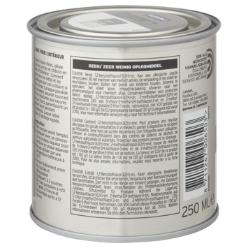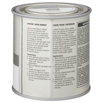 Voor een optimaal resultaat van de GAMMA binnenlak behandel je de ondergrond eerst met de GAMMA grondverf voor binnen. Het blik heeft een inhoud van 250 milliliter, dit is voldoende voor een oppervlakte van ongeveer 3 m². Een uur na het aanbrengen van de verf is deze reeds stofdroog, na 20 uur kan je de volgende laag aanbrengen. Verwerk de verf bij temperaturen tussen de 8 en 25°C.